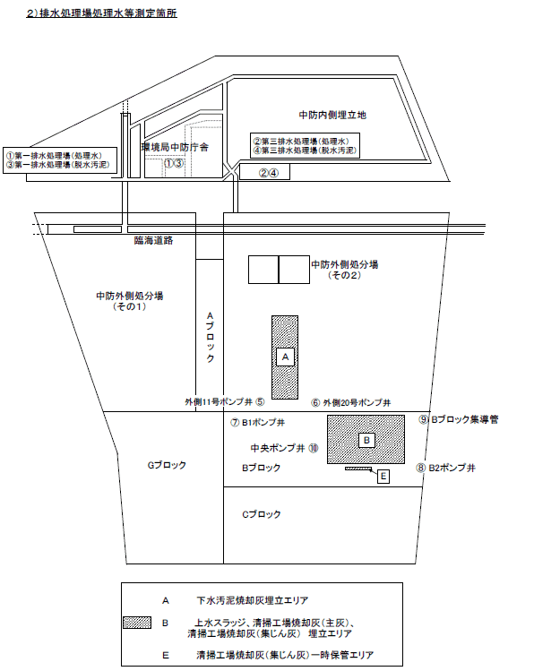第一排水処理場の処理水と汚泥、外側浸出液(20号ポンプ井) 、Bブロック浸出液(B2ポンプ井、集導管)