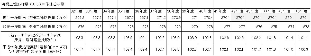 清掃工場処理量予測値は平成32年度が276万トンから平成38年度、平成39年度には279万トン、平成39年度以降減少傾向で推移としている。